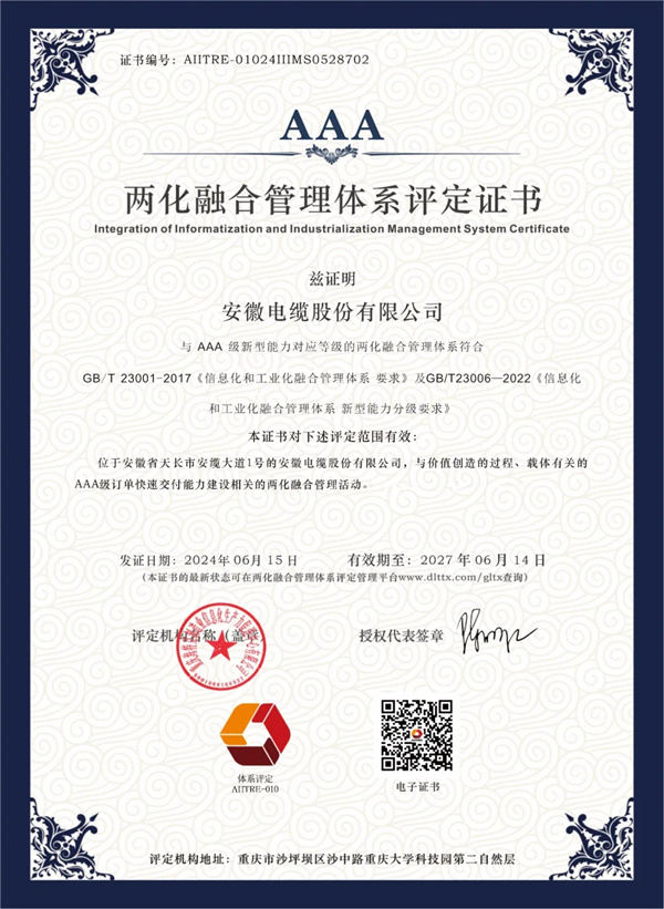 安徽省線纜行業(yè)——首家AAA級(jí)獲證企業(yè)